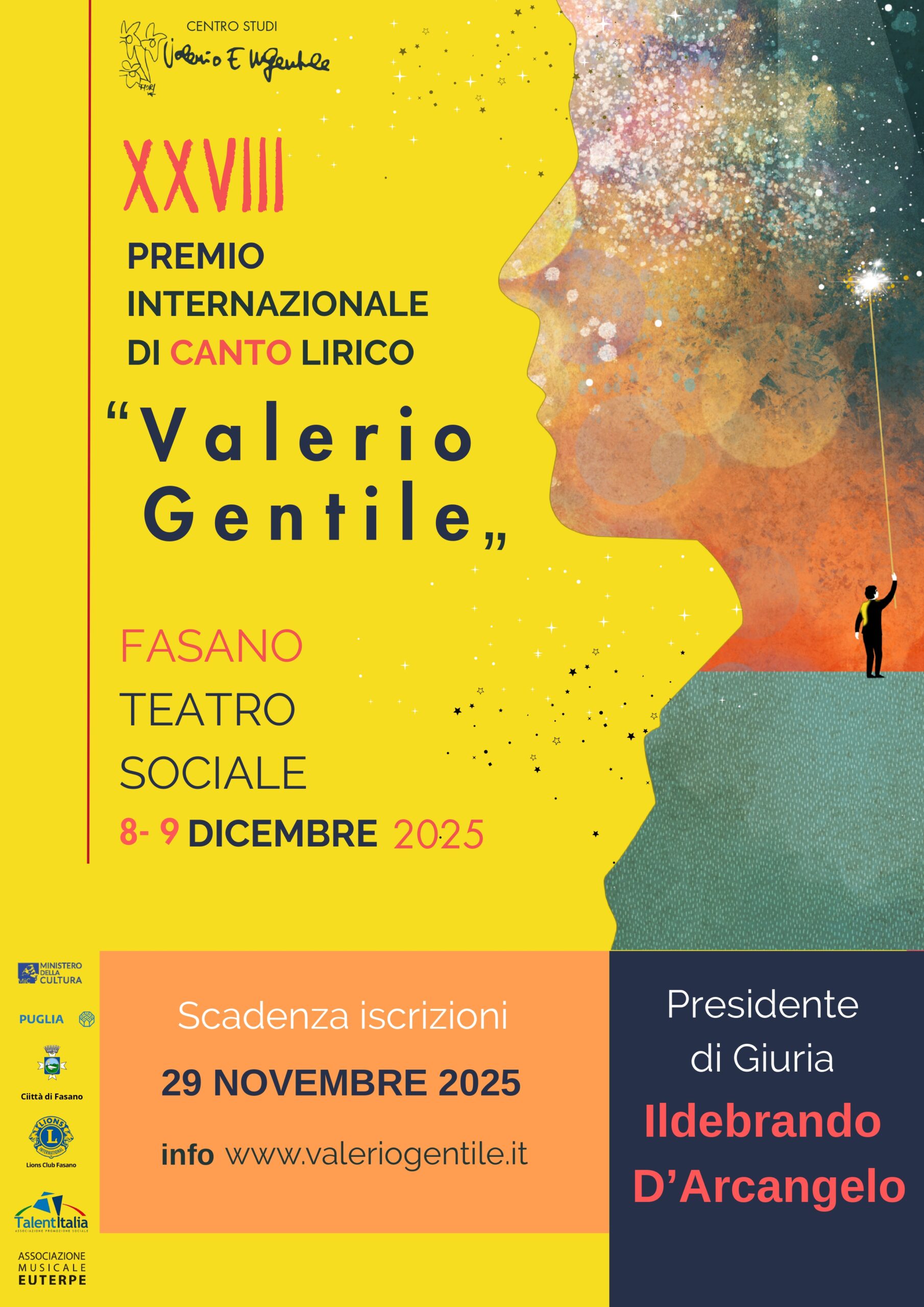 Art. 1) Per ricordare Valerio Gentile, giovane cultore di musica e studente di canto lirico, prematuramente e tragicamente scomparso, la sua famiglia, in collaborazione con i Conservatori di Musica “N. Piccinni” di Bari e “N. Rota” di Monopoli, ha istituito nel 1997 il Premio Internazionale di Canto Lirico – Borsa di Studio “Valerio Gentile”. Il concorso si svolge ogni anno nelle giornate 8 e 9 dicembre presso il Teatro Sociale di Fasano.